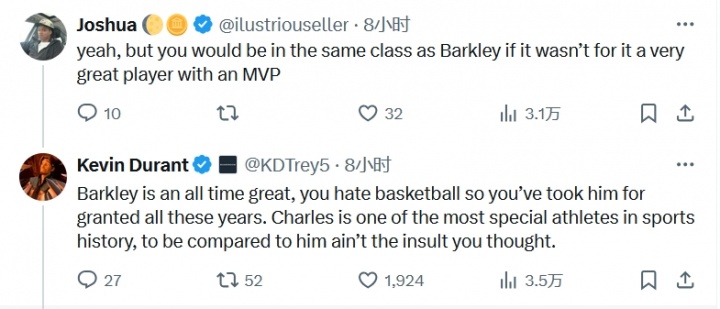 球迷回应杜兰特:“如果你不是来到了一支拥有MVP的出色球队,你也就是一个查尔斯-巴克利。”